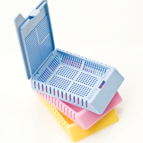 The cassettes also feature sloped walls, creating a basket for small tissue management. These two piece cassettes with hinged lids have been designed for the Leica IP C Cassette Printer.