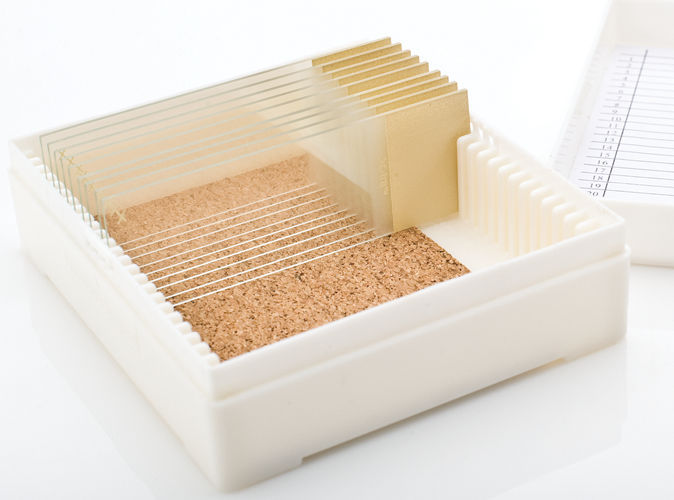 The 25 Slide Box is made of high impact polystyrene to securely hold 25 slides. The slots are numbered, with an index in the lid, which is tight fitting to ensure complete protection of the slides.